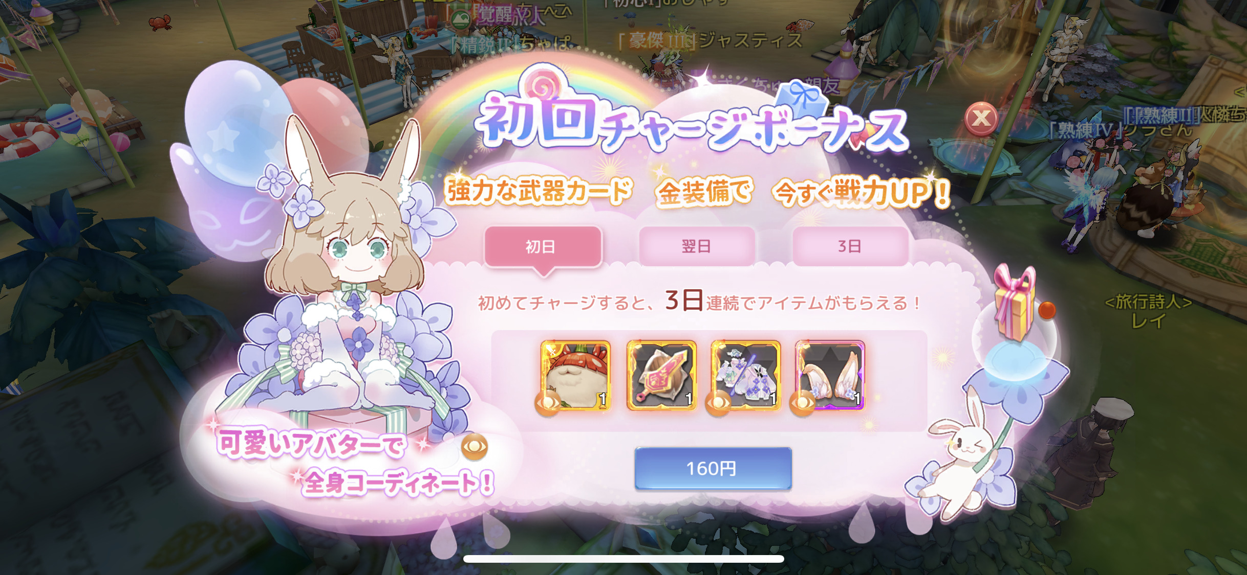 特に初回チャージは160円で強力な武器やアイテム、キャラクターを揃えることができるから買わないともったいない!!!